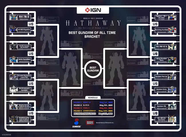 Gundam сражаются 1v1. Победитель каждого матча определяется голосами зрителей. Все матчи раунда проходят одновременно. Голосуйте через опросы на странице. Победители переходят дальше. Возвращайтесь к странице в даты этапов, чтобы увидеть обновлённые опросы.