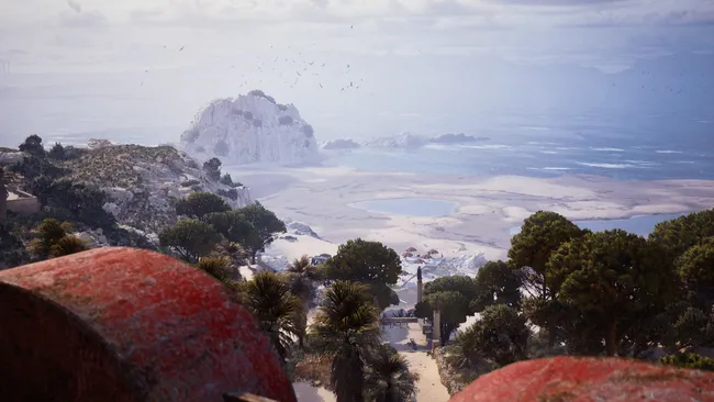 Карта Riven Tides — песчаный пляж с пальмами, отель Panorama Azzurro с водными горками, теннисные корты и гавань.