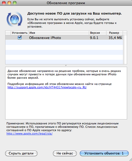 Новая версия под номером iPhoto 9.0.1. Обновить можно даже не легально установленную версию.